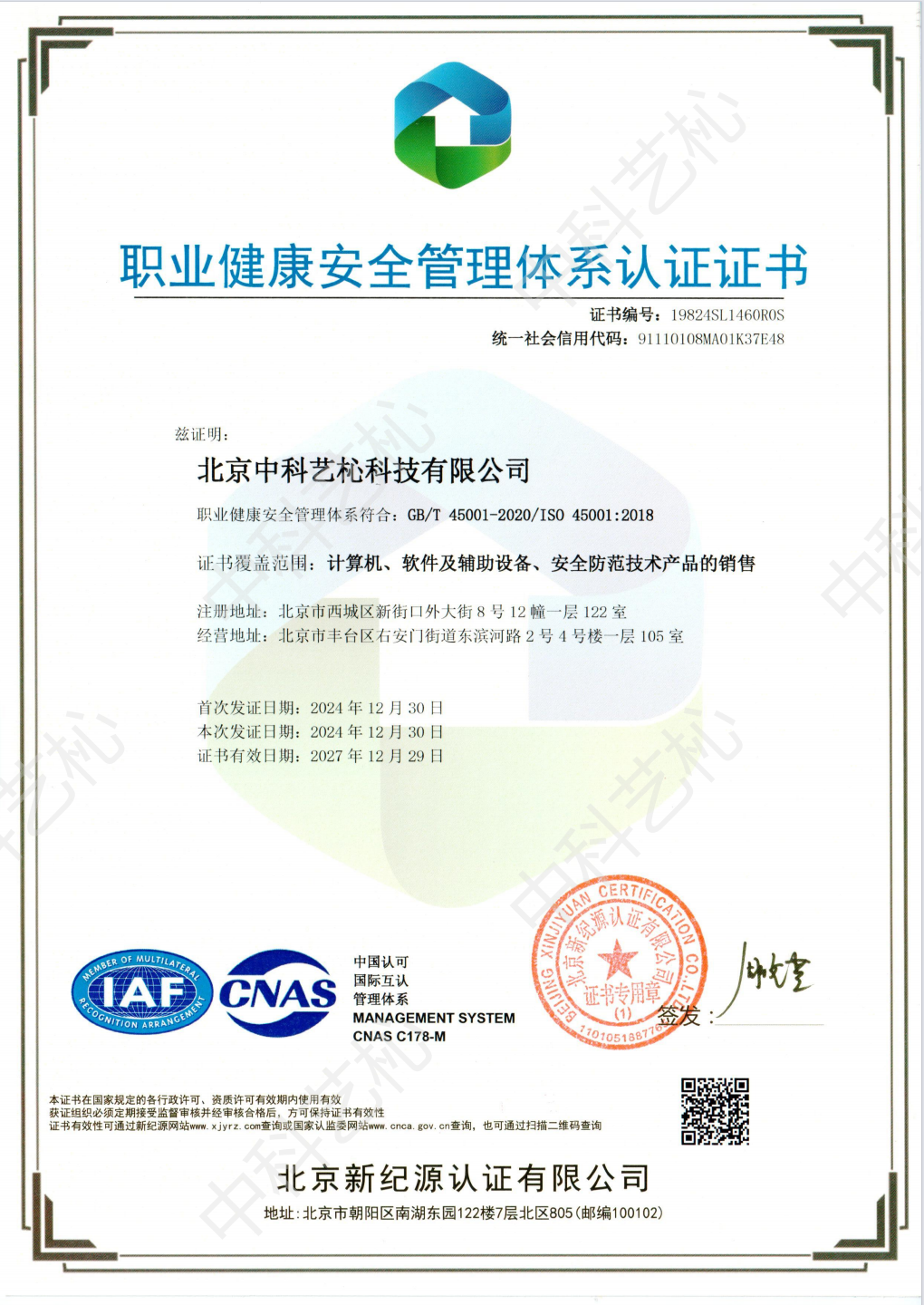 职业健康安全管理体系认证证书
